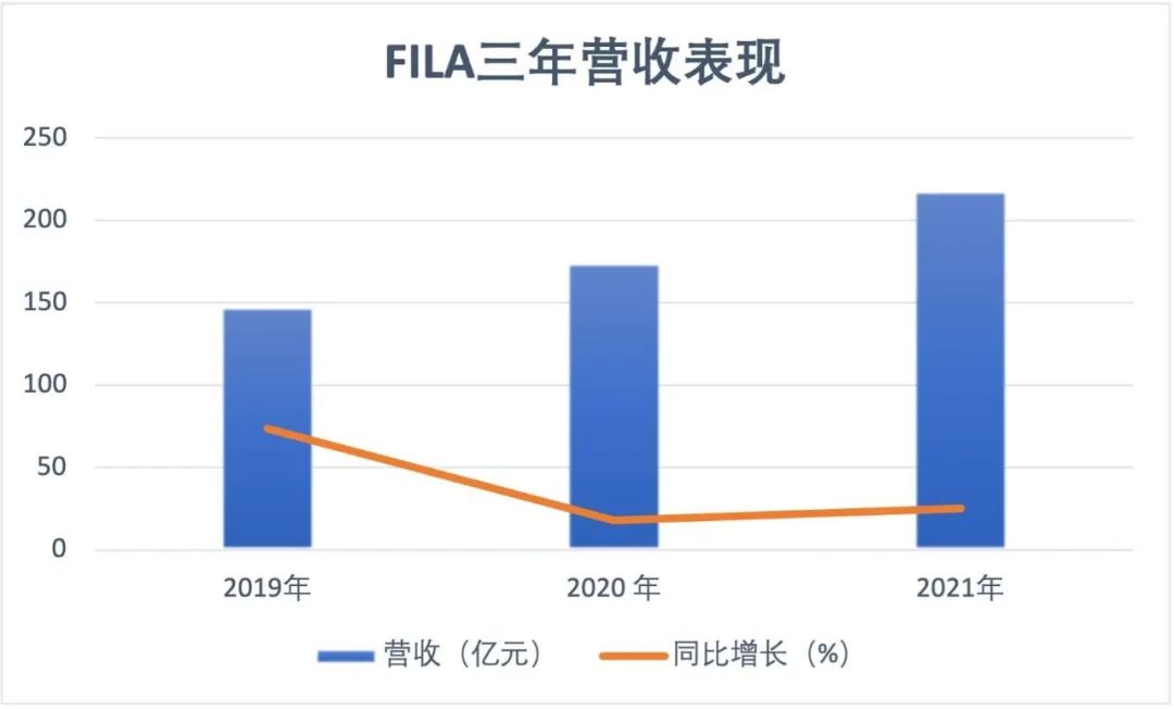 2019 年安踏首次在财报中披露 FILA 的经营数据,FILA 全年营收 147.70 亿元,同比增长高达 73.9%。2020 年和 2021 年,FILA 同比增长仅为 18.1% 和 2 5.1%。
