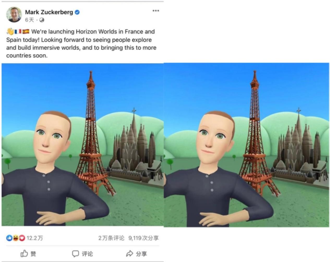 扎克伯格这边更是惨不忍睹,就在这几天,扎克伯格在 VR 社交平台 Horizon Worlds 上为自己虚拟化身拍的一张自拍,由于肢体僵硬,笑容诡异,身后简陋的巴黎埃菲尔铁塔和西班牙圣家堂荒凉得令人心酸,瞬间在全球范围内引发狂热的群嘲。
