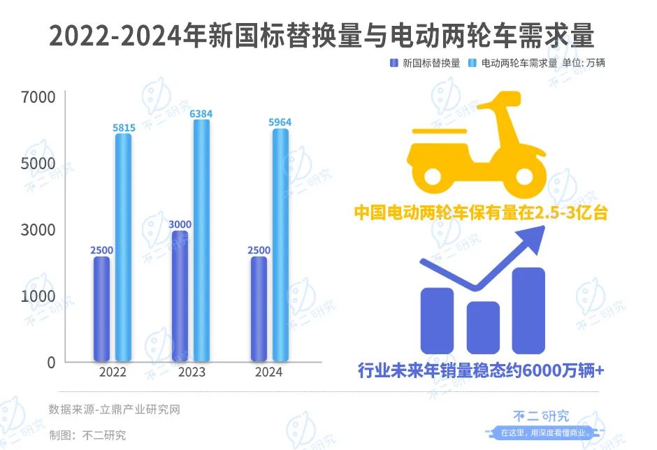 根据立鼎产业研究网数据,我国电动两轮车保有量在2.5亿-3亿台,预计2022-2024年新国标替换量为2500万、3000万、2500万辆,预计2022-2024年电动两轮车需求量为5815万、6384万、5964万辆,行业未来年销量稳态约6000万辆+,行业下半场已至。