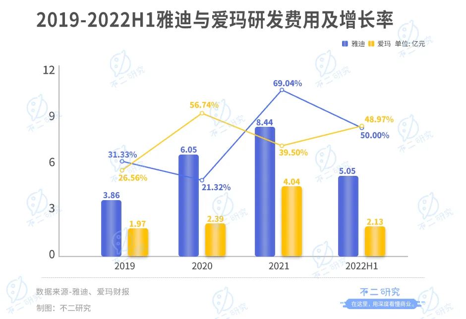 在研发投入方面,据雅迪财报显示,2019-2022上半年,其研发费用分别为3.86亿元,6.05亿元,8.44亿元,5.05亿元,分别同比增长31.33%,21.32%,69.04%,48.97%;据爱玛财报显示,2019-2022H1,其研发费用分别为1.97亿元,2.39亿元,4.04亿元,2.13亿元,分别同比增长26.56%,56.74%,39.50%,50.00%。