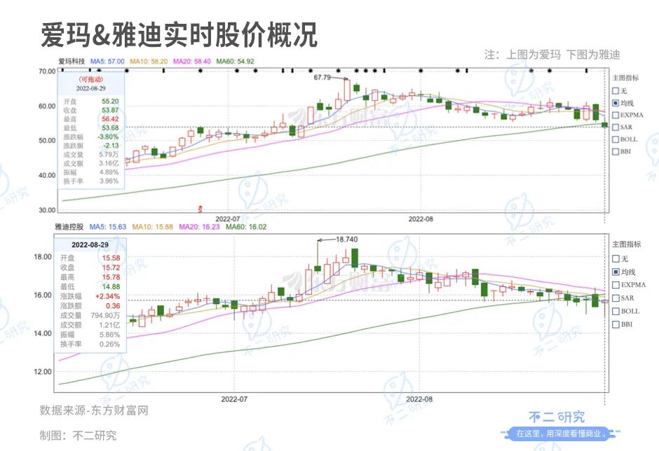 截至8月29日,爱玛报收53.87元/股,对应市值309.6亿元;雅迪报收15.72港元/股,对应市值481.6亿港元。