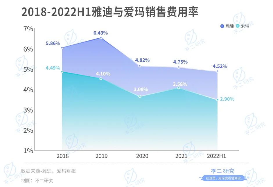 从销售费用投放上看,雅迪与爱玛均在控制销售费用率。据雅迪财报显示,2018-2022上半年雅迪的销售费用率为5.86%,6.43%,4.82%,4.75%,4.52%;据爱玛财报显示,其同期销售费用率分别为4.49%,4.10%,3.09%,3.58%,2.90%。