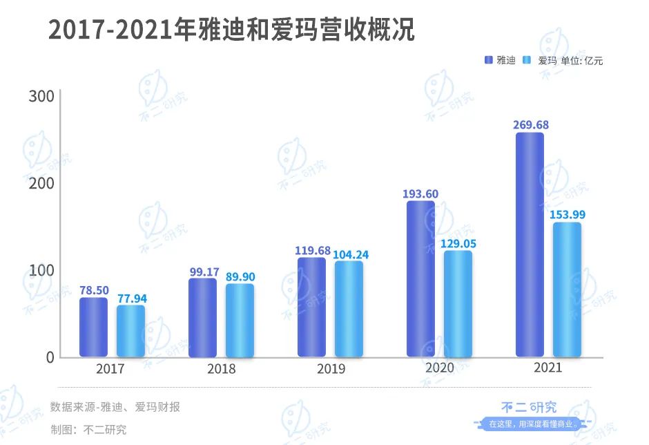 从经营数据更可见一斑,据雅迪和爱玛的财报显示,2017-2021年,雅迪的营收分别为78.50亿、99.17亿、119.68亿、193.60亿、269.68亿元;而同期爱玛的营收则为77.94亿、89.90亿、104.24亿、129.05亿、153.99亿元。爱玛和雅迪之间的营收差距2017年仅为0.56亿元,到2021年差距拉到了115.69亿元。