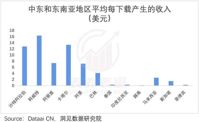 不过,东南亚地区平均每下载产生的收入,却不及中东地区。