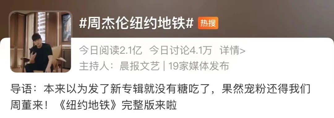 8月29日,#周杰伦纽约地铁#、#周杰伦隐藏新歌#两个话题登上微博热搜,截至8月30日晚10点,两个话题相关内容阅读量分别达到2.1亿、1301万。
