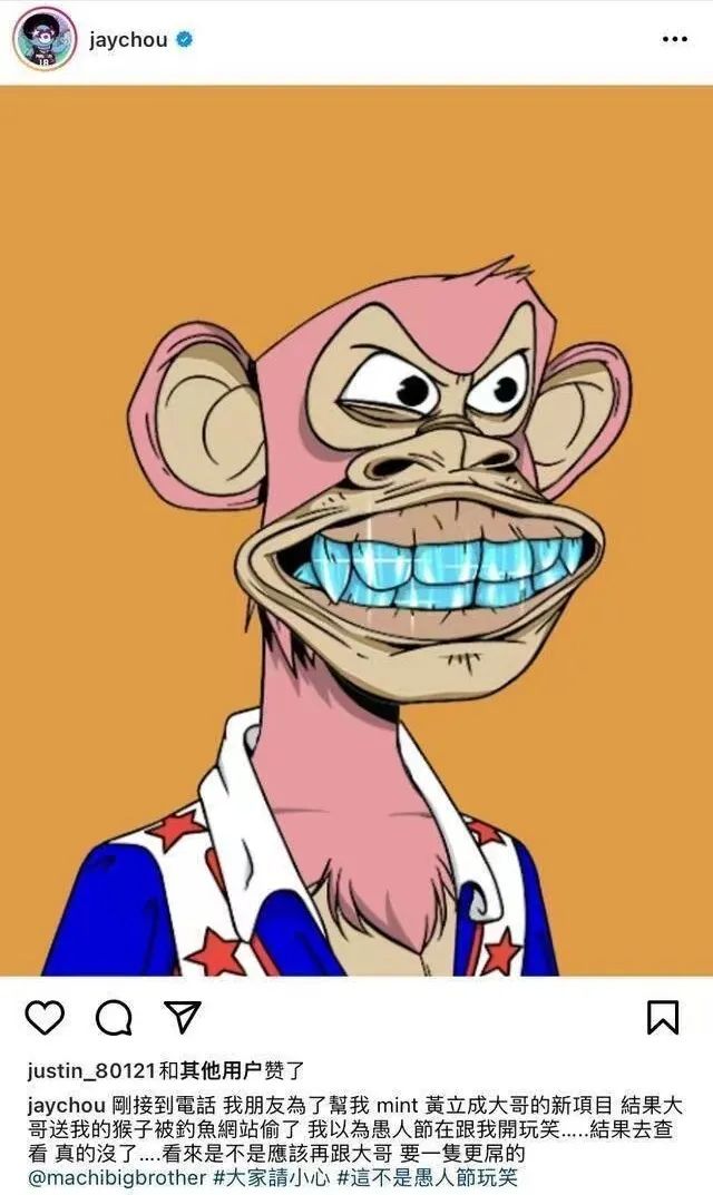 在被质疑“收割”粉丝后三个月,周杰伦自己也在NFT上吃了亏,4月1日,周杰伦发文称,自己购买的无聊猿NFT藏品被盗,经过多次转手最终卖出300万元的天价。而由于NFT的去中心化属性以及相关法律缺位等因素,对于NFT被盗,损失惨重的周杰伦也维权无门。
