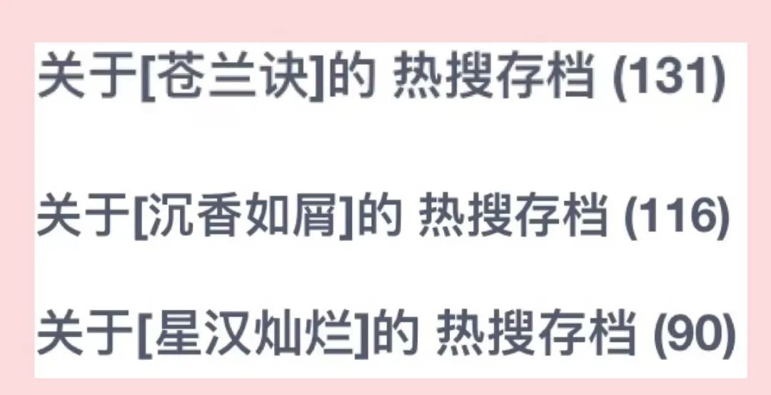 《星汉灿烂》56集的超长播出周期,总计才有90个微博热搜;同样分上下两部59集的《沉香如屑》,116个微博热搜;而《苍兰诀》现在还未播完,截至目前就达131个微博热搜。