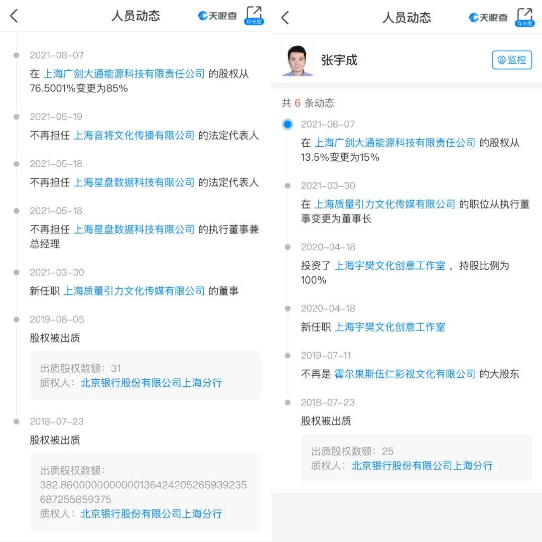 公司另外一个创始人张宇成也在2018年股权被出质。2019年最大变动是,金融资本的投资人王正、石博、唐艺绮相继退出张宇成的伍仁影视文化。