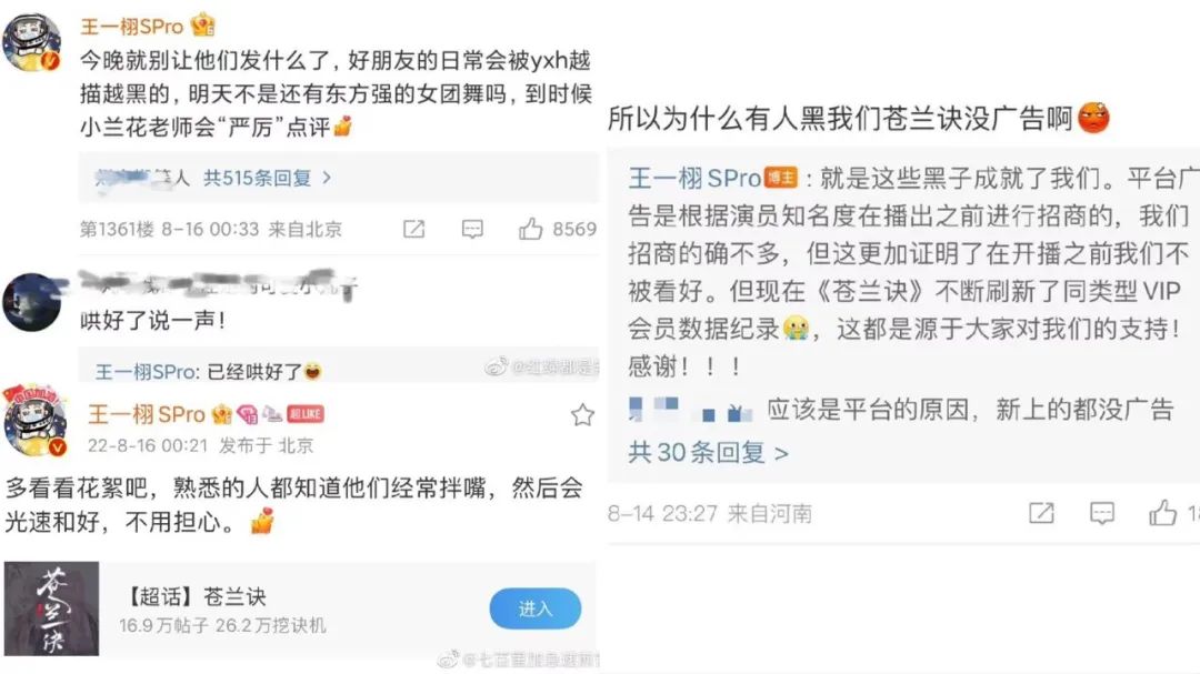 连剧集招商少这种事,王一栩也不忘肯定粉丝的努力。王一栩称“黑子”(黑粉,真没见哪个制片人直接使用这种饭圈用语的)成就了《苍兰诀》,一开始不被看好,后来因为粉丝努力而不断刷新爱奇艺同类型会员数据记录。