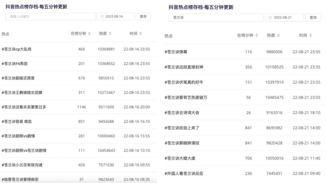 抖音热榜的差距更是悬殊。《苍兰诀》从播出第二天,就“常驻”热榜,平均每天5个热榜话题,最多一天多达10个热榜话题。而《星汉灿烂》一个热榜也没上过。《沉香如屑》虽然几乎每天都有上榜,但数量不多,1-4个,而且并非都是正面话题。