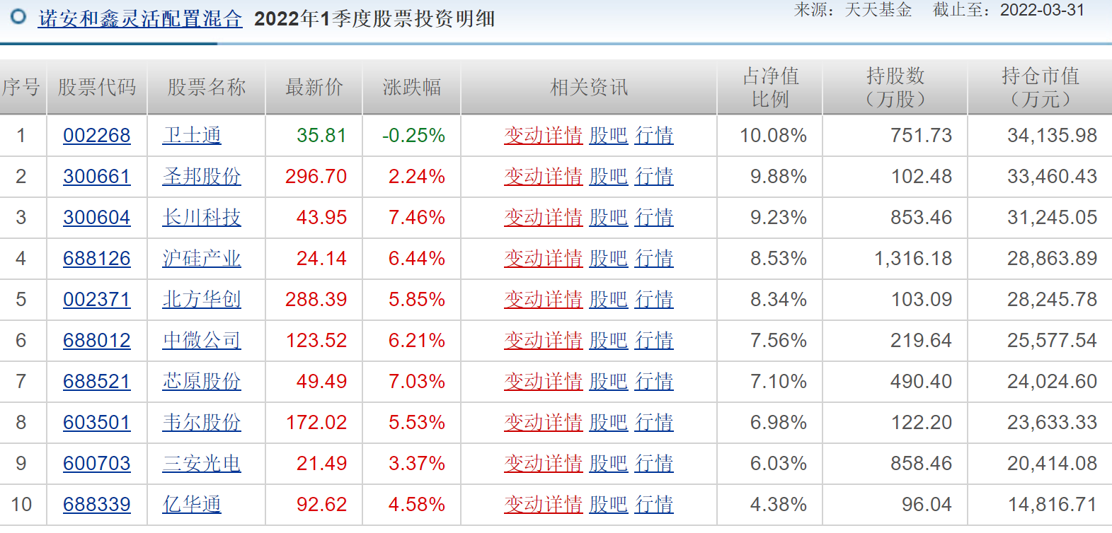 据天天基金网显示,截至2022年一季度,该基金前十大重仓股分别为卫士通、旗天科技、数字认证、京北方、新国都、浪潮软件、数据港、科蓝软件、普联软件、宝兰德,其中卫士通占股9.39%。与2021年四季报相比,今年一季报前十大重仓股差不多全换了。