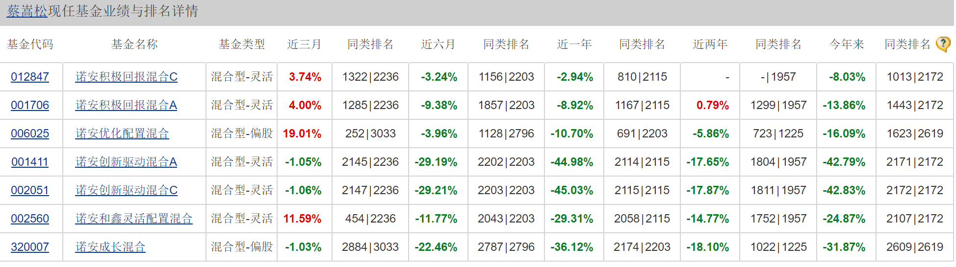 而诺安和鑫灵活配置混合收益率-24.87%,同类排名2014|2067;诺安成长混合收益率则为-31.87%。近六月来蔡嵩松旗下基金的业绩更加惨不忍睹,诺安创新驱动混合A/C收益率分别为-29.19%、-29.21%;诺安和鑫灵活配置混合收益率-11.77%;诺安成长混合收益率-22.46%;近一年来旗下基金也全部都处于亏损状态,亏损幅度在同类型偏股型产品中排名殿后。
