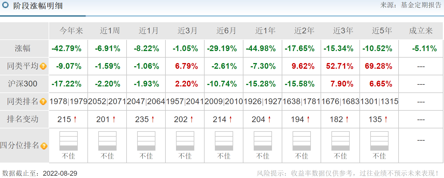 据天天基金网显示,诺安创新驱动混合A成立于2015年6月18日,截至5月31日净值为0.8480,近6月收益率-29.19%,今年以来收益率-42.79%。即使把时间周期拉长,近1年来收益率-44.98%,近2年来收益率也是-17.65%,近3年、近5年均跌超10%。可以看出,自基金成立来收益率也是亏损,长期如此稳定亏钱的基金也是罕见。