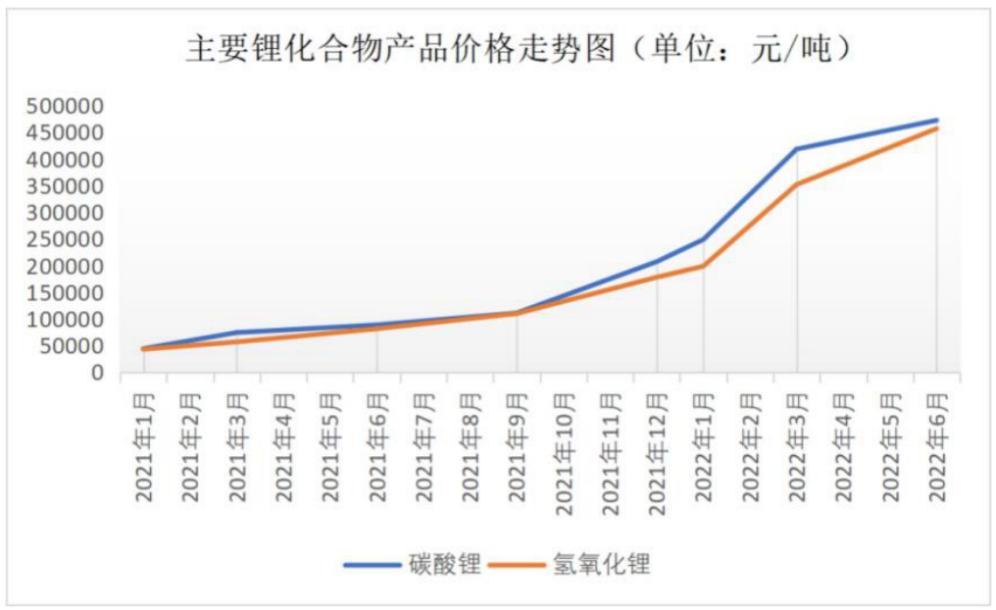 毛利的大幅提升背后是锂产品价格飙升。随着新能源汽车的持续增长带动动力电池产量的提升,下游对锂盐的需求催升锂产品价格。2020年9月份,电池级碳酸锂的价格从最低的4万元/吨左右启动,到2022年一季度攀升至约50万元/吨。根据亚洲金属网的数据,截至2022年6月底,电池级碳酸锂和电池级氢氧化锂的市场价格分别为47.55万元/吨和47.75万元/吨,较年初分别上涨71.35%和123.65%。