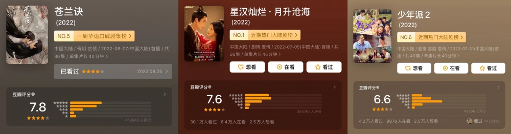 《苍兰诀》豆瓣开分7.8、刚刚收官的《星汉灿烂》豆瓣评分7.6、《少年派2》豆瓣评分6.6,两部古偶的成绩,不仅在暑期档成绩亮眼,就算是放在内娱灿若银河的古偶市场中,也是甩开许多平台所谓“剧王”项目(《沉香如屑》:《琉璃》的皮,《香蜜》的衣,二婚cp隔着“壁”)相当一段距离的高分段选手。