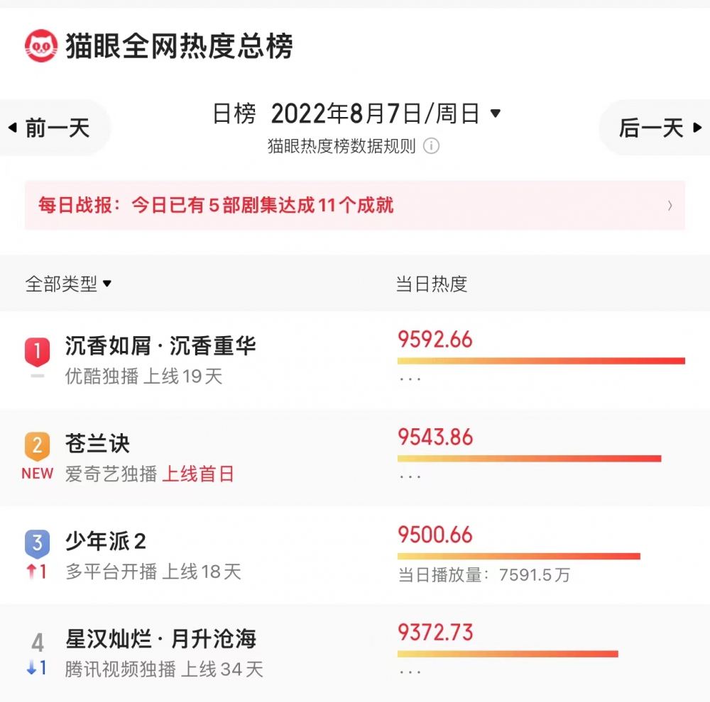 而其中《苍兰诀》和《星汉灿烂》,更是从上榜以来,几乎从未掉出过前三的行列。