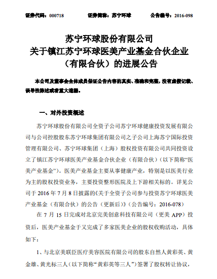 苏宁环球医美投资基金收购11家医美医院及诊所,截图自公司公告