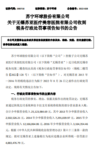 不过,亚洲第一医美品牌的美名还未传出,苏宁环球旗下医美公司就先被罚了款。2022年8月18日,苏宁环球发布关于无锡苏亚收到税务行政处罚事项告知书的公告,称要对无锡苏亚2013年—2016年的税收违法行为拟于2022年8月26日之前作出行政处罚决定。
