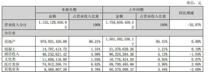 具体来看,房地产收入9.76亿元,占比86.21%;医疗美容收入0.75亿元,占比6.62%;酒店收入0.46亿元,占比4.08%;混凝土收入0.15亿元,占比1.31%;文化类收入0.12亿元,占比1.03%;其他业务收入0.09亿元,占比0.76%。