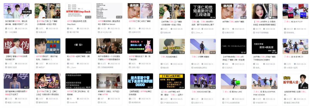 每一次八卦事件,都是自媒体创作者的一场赶考。在B站,关于此事的讨论与二创也很快占领了徐开骋搜索的首页。至于未来能否超越丁泽仁,还要看网友的考古力度——“你是我唯一的姐”之后,丁泽仁当年在《偶像练习生》中的一段表演也被挖出,BGM被替换为无数kpop热曲,或者整个人被P进韩团练习室中,其中有不少取得了数十万、百万的播放量。