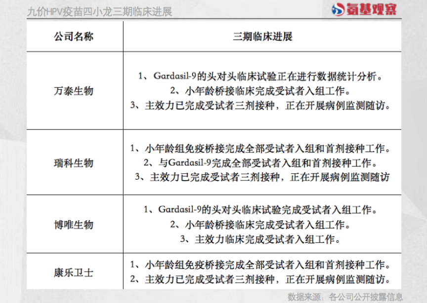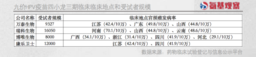 目前,已经有4家企业开启九价HPV疫苗三期临床,分别是万泰生物、瑞科生物、博唯生物和康乐卫士。