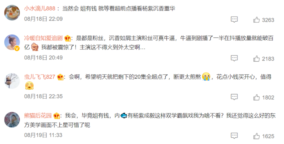 对于《星汉灿烂》《沉香如屑》这种分了上下两集,更新周期较长,且剧情以言情为主线的剧来说,直通大结局对深度追剧观众来说是可以接受的。在不少营销号关于沉香如屑超前点播的讨论中,不少粉丝都表示自己愿意花钱看超前点播,“断更太煎熬,花点小钱买开心”。