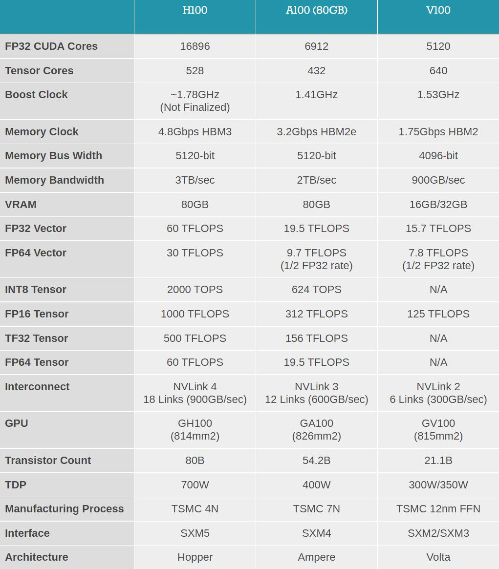 H100则是一款针对大模型专门优化的产品,在今年3月份在GTC大会上才发布,采用了最新的Hopper构架,应用的也是台积电最先进的4nm工艺,拥有800亿个晶体管,GPU最大功率800W。