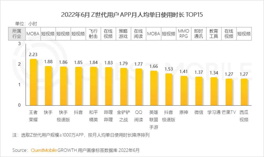 根据QuestMobile发布的《2022 Z世代洞察报告》显示,Z世代用户APP月均单日使用时长的前15名中,快手、快手极速版仅次于《王者荣耀》,位列第二、第三,领先于微信、抖音、B站等一系列社交和内容产品。