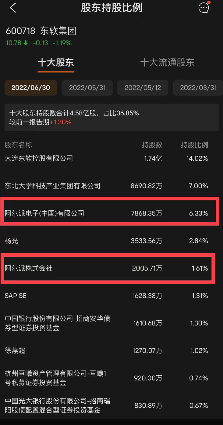 最后值得一提的是,东软集团第二大机构股东是日资公司。目前,东软集团第一大股东是大连东软控股公司,持股14.02%。第二大股东是东北大学科技产业集团,持股7%。第三大股东是阿尔派电子公司,持股6.33%,第四大股东杨光,持股2.64%,第五大股东阿尔派株式会社持股1.61%,日本阿尔派株式会社合计持股 7.94%,为合计持股第二大股东。