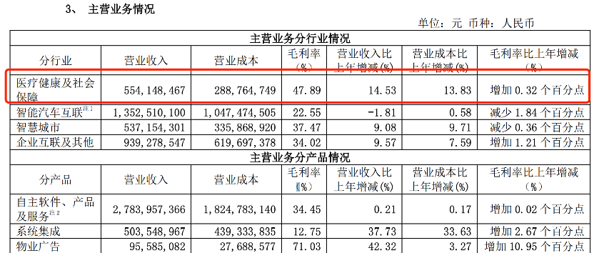 根据东软集团半年报披露的信息看,医疗健康及社会保障业务是东软集团第三大收入来源,并且是毛利率最高的主营业务。