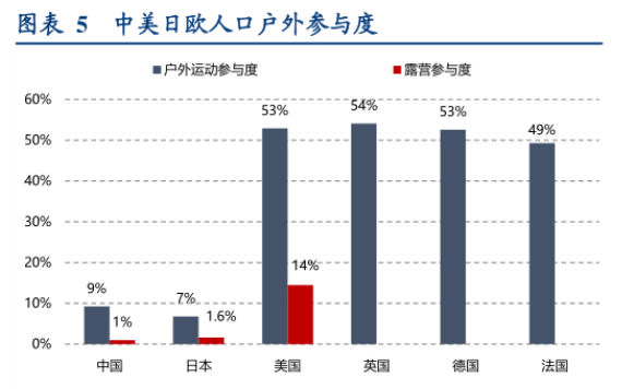 据华创证券研报,2019年,中国参与户外运动人口约为 1.3 亿,在城镇人口中渗透率为 15%,在总人口中渗透率约为 9%。而欧美由于对户外生存教育比较重视,户外参与度普遍较高,比如美国户外运动人口参与度就达到了53%。