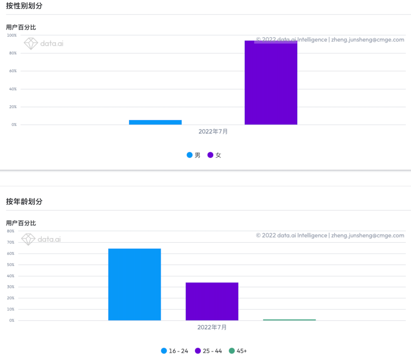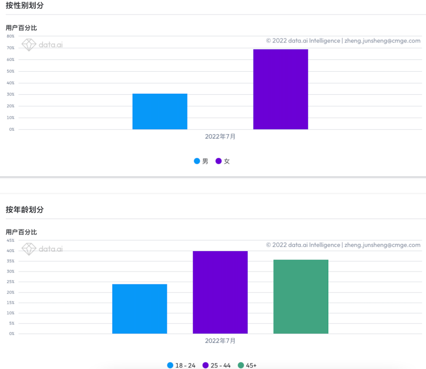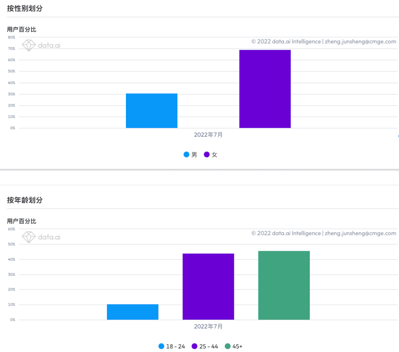 值得注意的是,多数厂商在日本市场多会以男性用户需求为主,往往忽略了女性用户的需求。而根据data.ai数据显示,《叫我大掌柜》用户画像中,女性用户占比接近70%,而年龄层来看25岁以上用户占比接近90%。