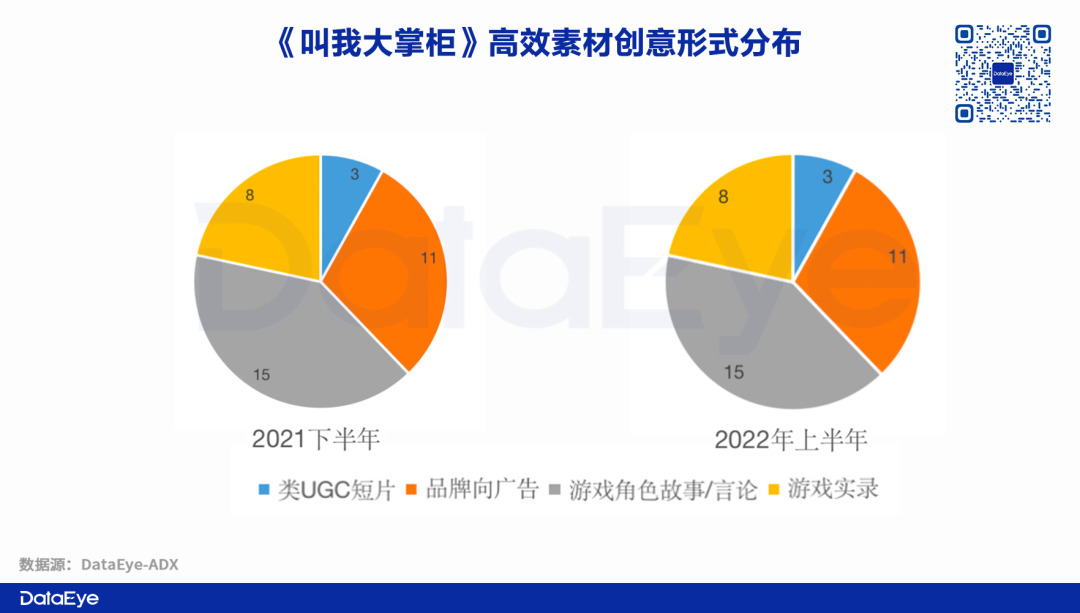 因此在营销侧,《叫我大掌柜》从2021年下半年与2022年上半年保持着近乎相同的素材投放量,用更多广告素材去撬动女性用户的下载。