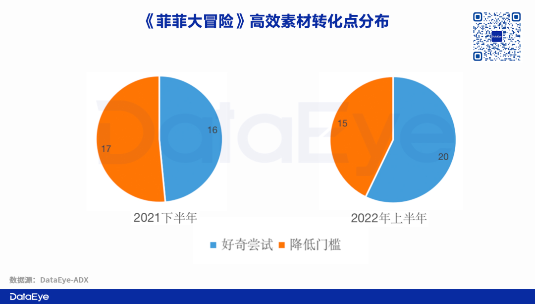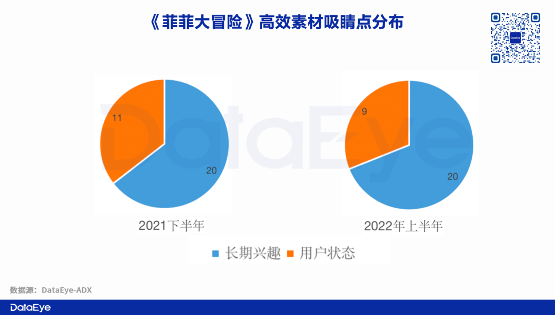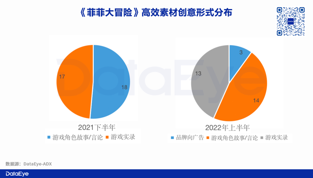 在创意形式上,《菲菲大冒险》2021年下半年高效素材中,“女主视角”+“剧场动画”+“类游戏实录”素材占据90%的比例。但到了2022年上半年,这一创意思路的占比降低至70%,同时也出现了更多类品牌向广告。