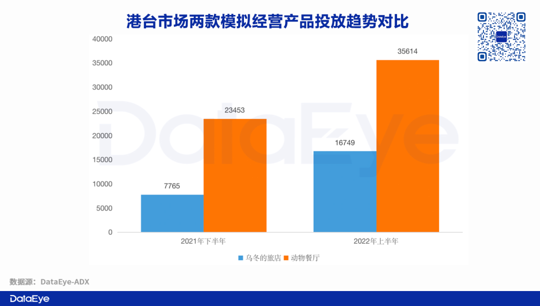 在市场投放方面,成都卓杭在2022年上半年明显增加了投放预算,《乌冬的旅店》素材投放量与2021年下半年相比增长了116%,而《动物餐厅》素材投放量也增长了约52%。