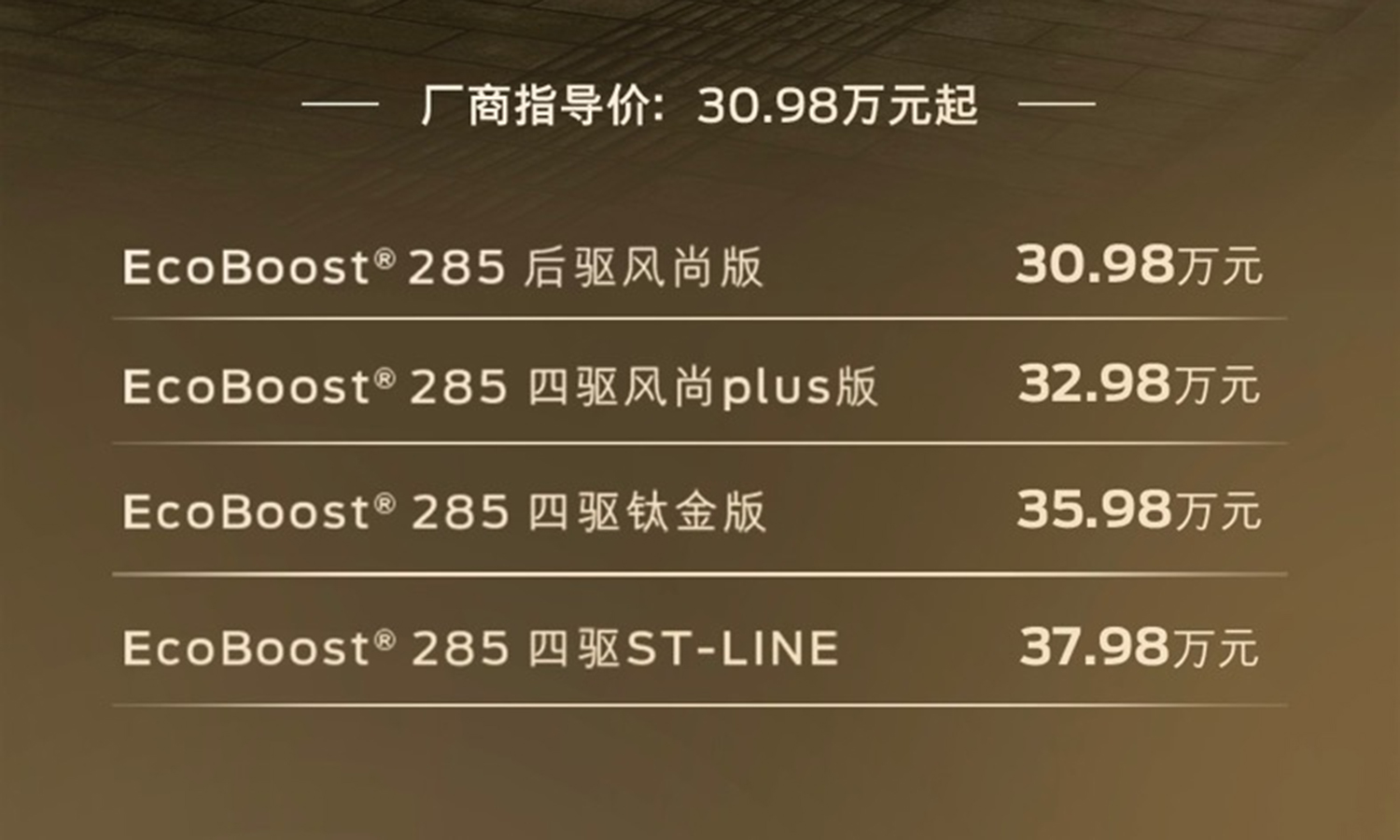 动力方面,全新福特探险者采用福特最新的纵置后驱平台,依旧配备与现款相同的2.3T涡轮增压四缸发动机,最大功率276马力,最大扭矩425牛·米,传动系统将匹配10速手自一体变速箱,0-100km/h加速时间为7.6秒。