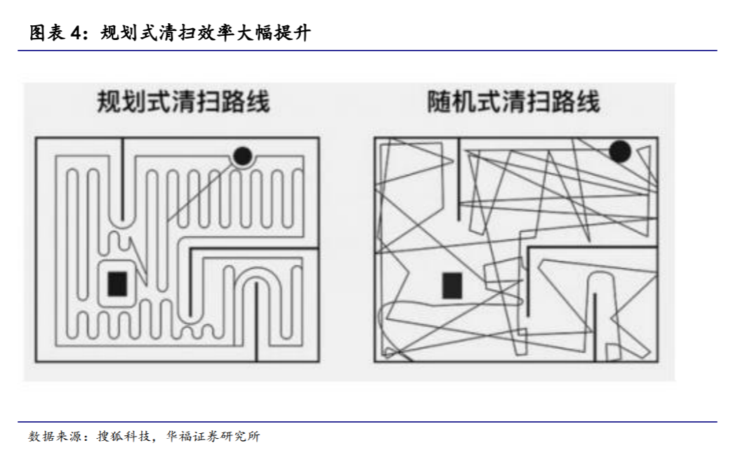 扫地机器人清扫路线对比,图源华福证券《扫地机器人行业深度报告》