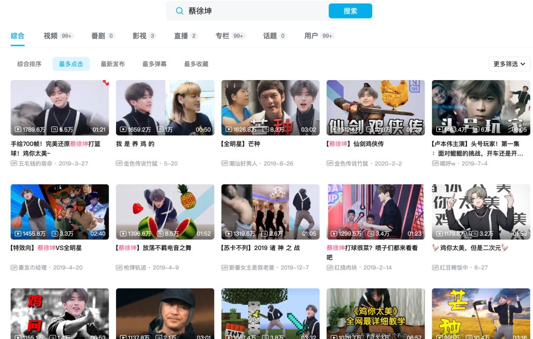 没想到如今三年过去,这个梗居然又迎来了复兴。打开B站“蔡徐坤”标签下的视频,可以分明地观察到这个梗的起落。