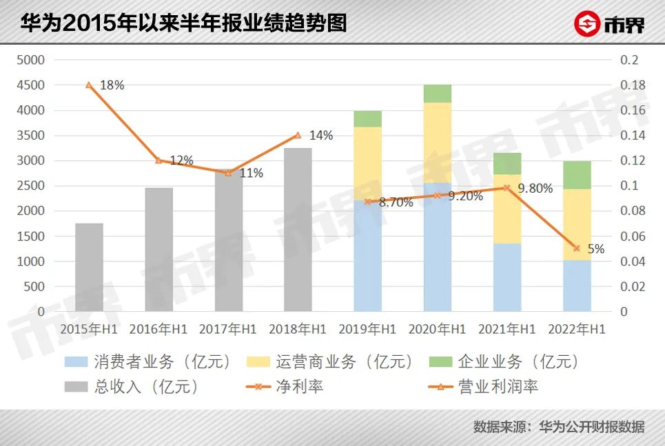 8月份公布最新半年报数据显示,华为2022年上半年收入3016亿元,同比小幅减少了5.87%,净利润150.8亿元,同比明显减少了51.97%%,净利率则从9.8%跌至5%。