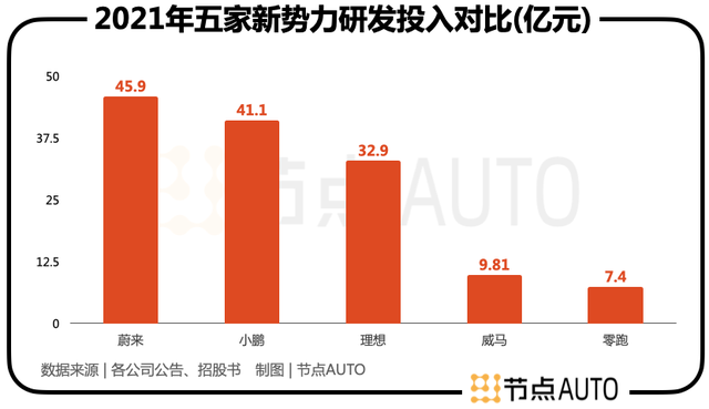2021年,“蔚小理”的研发投入分别是零跑的6.2倍、5.55倍、4.44倍,它们的研发投入规模集中在30亿元-50亿元之间。即便是销量已经落后于零跑的威马,其2021年的研发投入也要高于零跑。