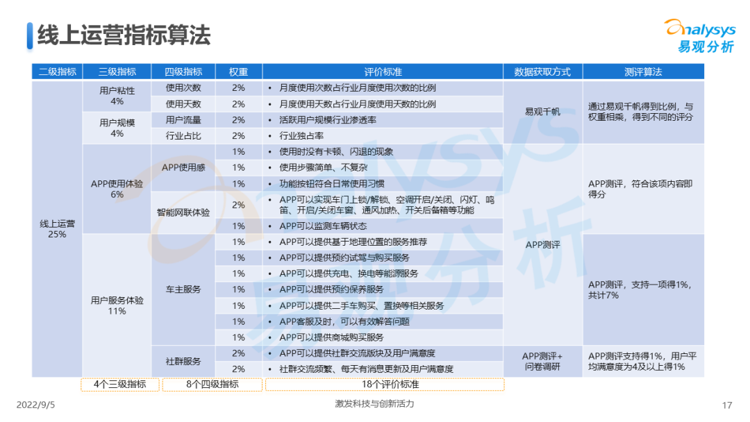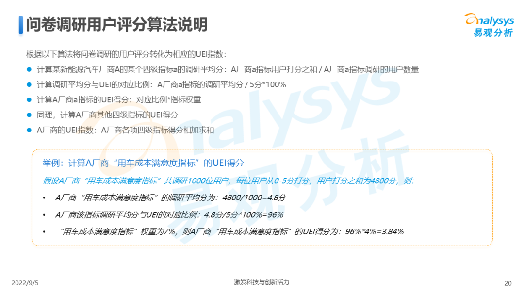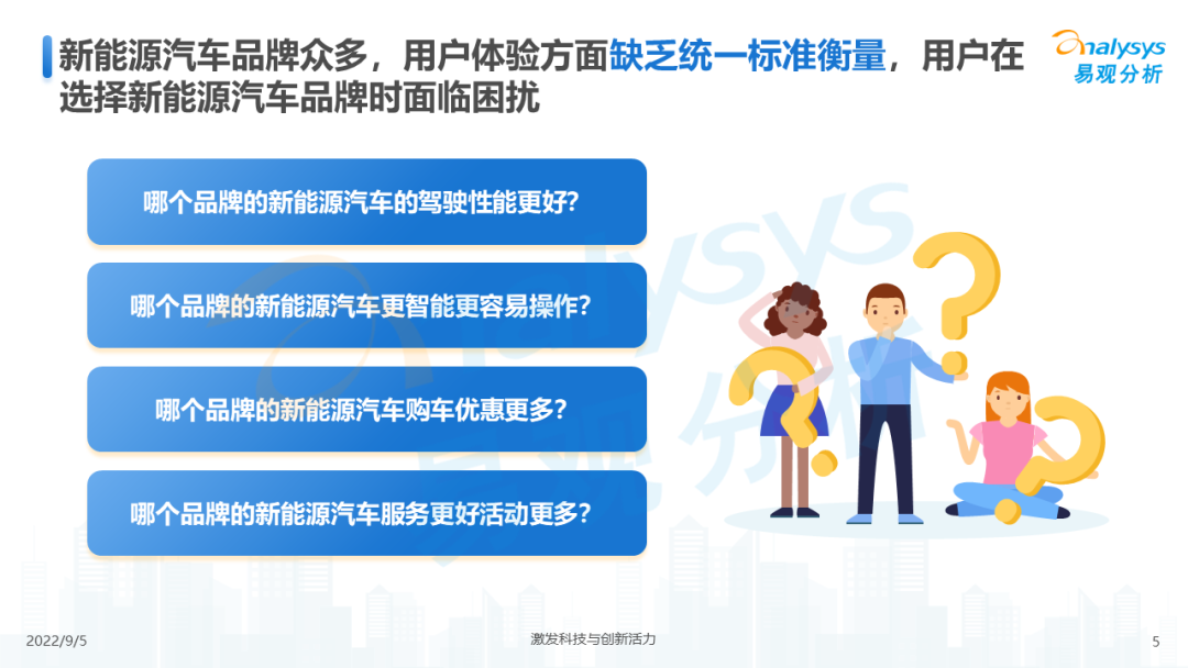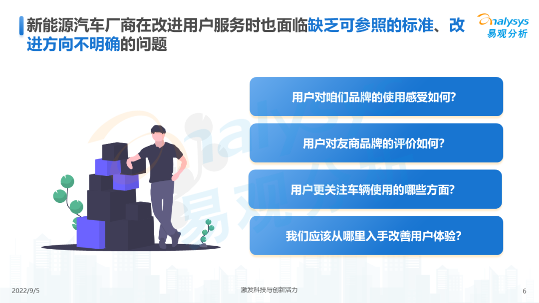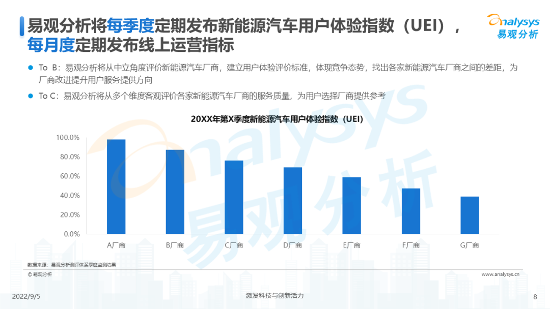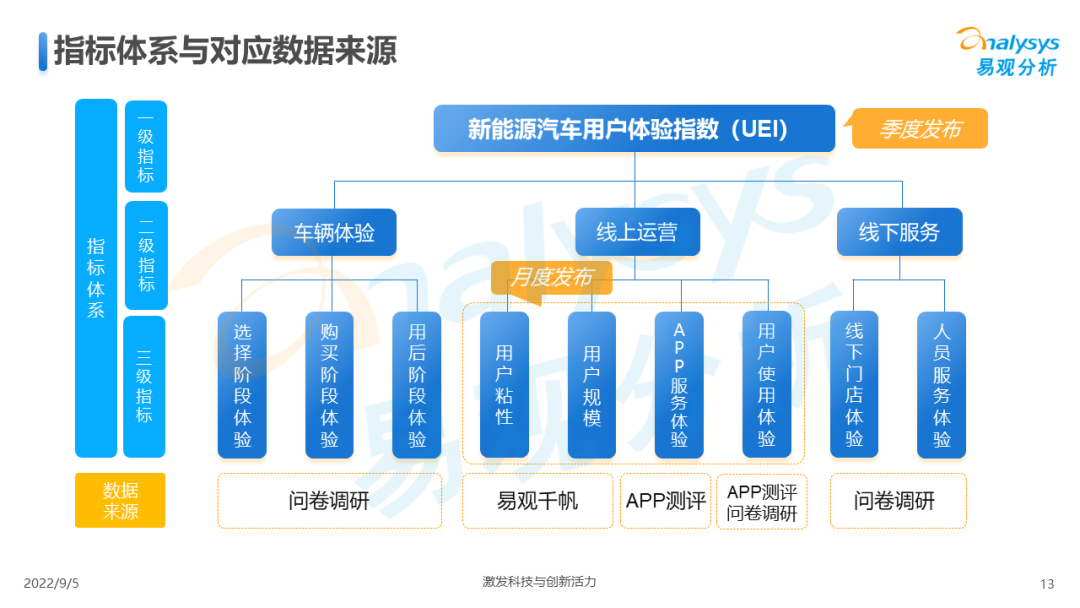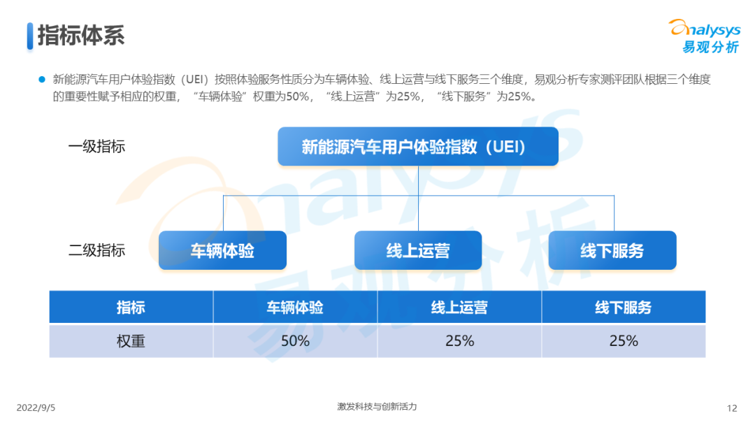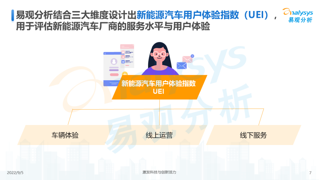 新能源汽车已经成为我国汽车市场再次崛起的关键支柱,新能源汽车市场发展快速,不同类型的品牌造车厂商呈现出百花齐放的态势。但是由于品牌众多导致各家的服务水平差异较大,从用户体验角度来看也存在着较大的差异。易观分析捕捉到市场与用户需求,设计并推出新能源汽车用户体验指数(UEI),将从客观中立的角度对各品牌新能源汽车的服务体验和用户体验进行评估,建立用户体验评价标准,形成体验指数,为各品牌的新能源汽车厂商改进、提升用户服务提供方向与指引,为潜在用户选择新能源汽车品牌车辆提供参考。