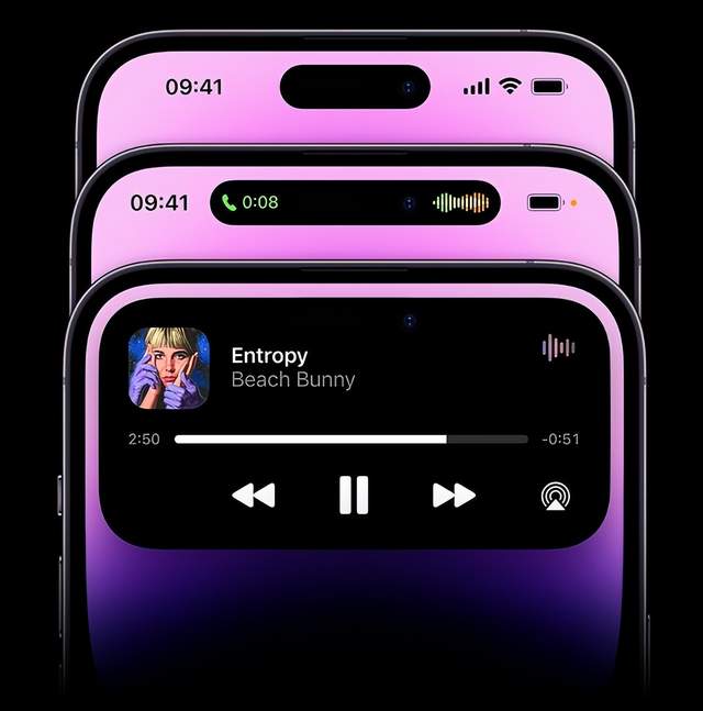 最戳中用户的则是Pro系列“灵动岛”的界面设计,这个空间能够清晰连贯的显示提醒和后台活动,让用户不会从当前正在使用的APP上分散注意力,模糊硬件和软件之间的区别。比如,用户可以通过灵动岛查看出租车、倒计时、导航等信息,而且每个提醒都有不同的动画。果粉们感叹到,灵动岛的设计,“把被吐槽的‘刘海区’变成了功能区,思路上有点超前”、“就像是变废为宝”。