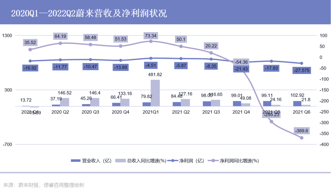 总得来说,“多赚点钱”这条路,蔚来上半年没有走通。其实,回望过去三个季度,从2021Q3开始到2022Q1,蔚来的营收都处于原地踏步阶段,到2022Q2,也没有多少改善。