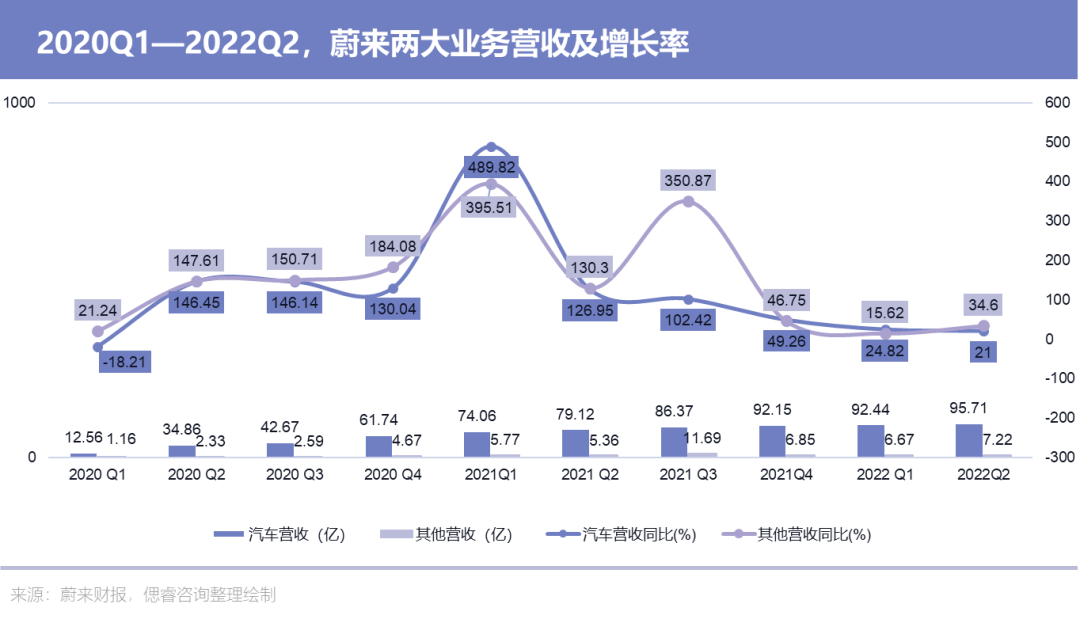 另一方面,ET7作为蔚来的首款轿跑,并没有顶起来销量,综合来看,上半年老款ES6依旧为销售冠军。ES6和EC6扛起销量大梁的同时,也就意味着,ET7拉动ASP了,但不多。直接反应在汽车业务营收上,Q2总营收95.71亿,同比增长21%、环比增长3.5%,数据算不上好看。