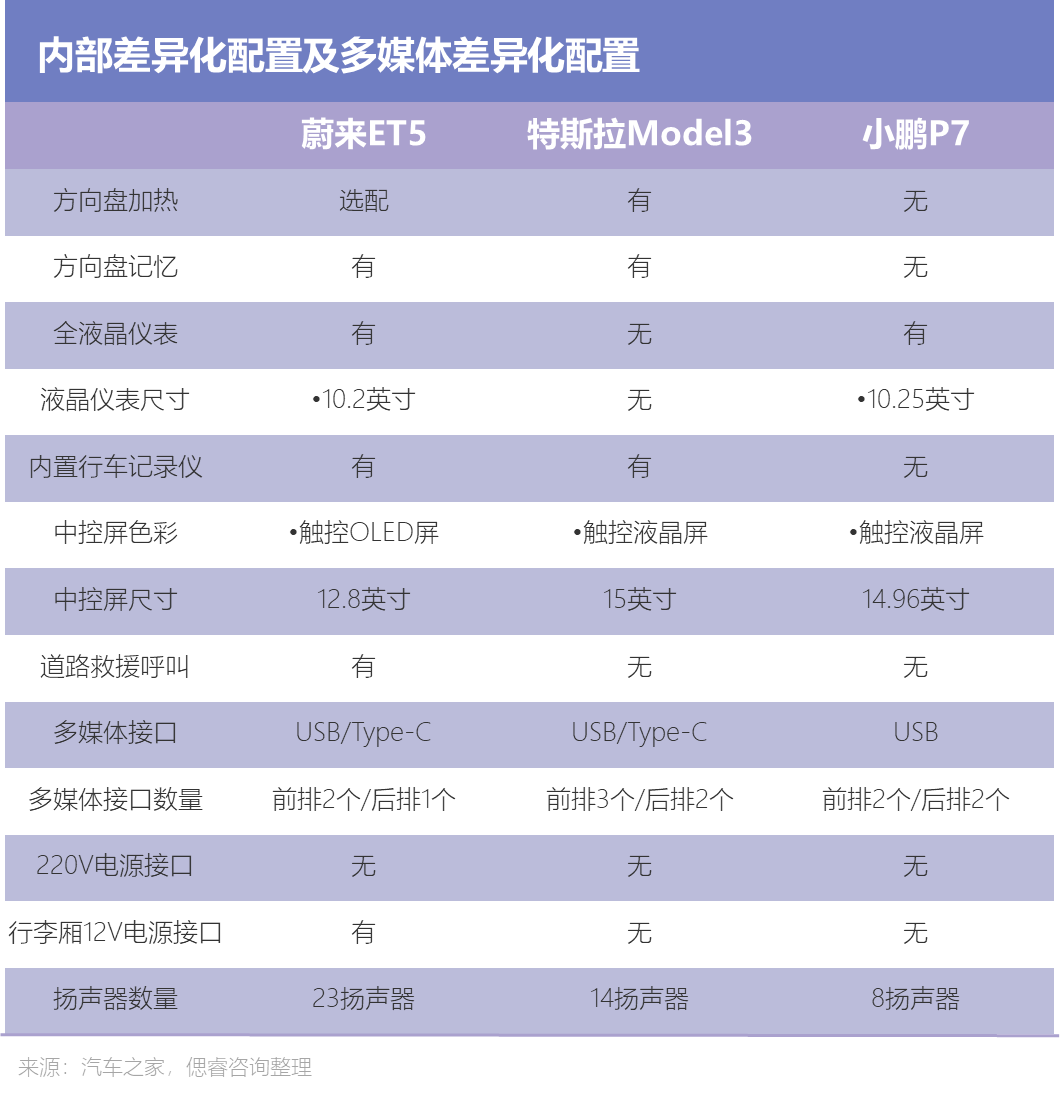内部及多媒体配置上,只有特斯拉有方向盘加热,但缺少了全液晶仪表;