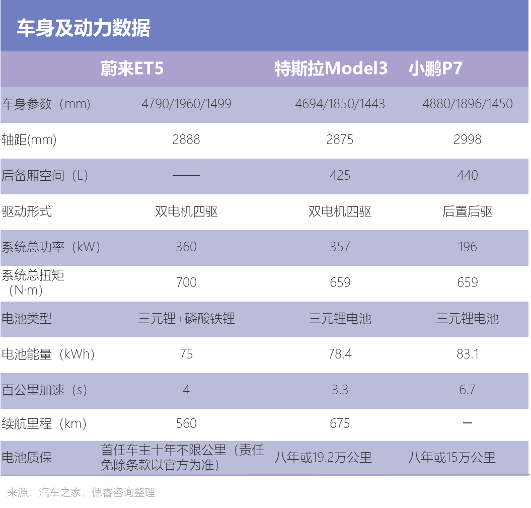 车身车身空间上,小鹏P7更占优势;动力性能上,ET5在总功率、扭矩上都占优势,但,续航、电池能量及百公里加速都不如特斯拉。同时,一个小福利是,针对首任车主,蔚来提供十年不限历程的电池质保。