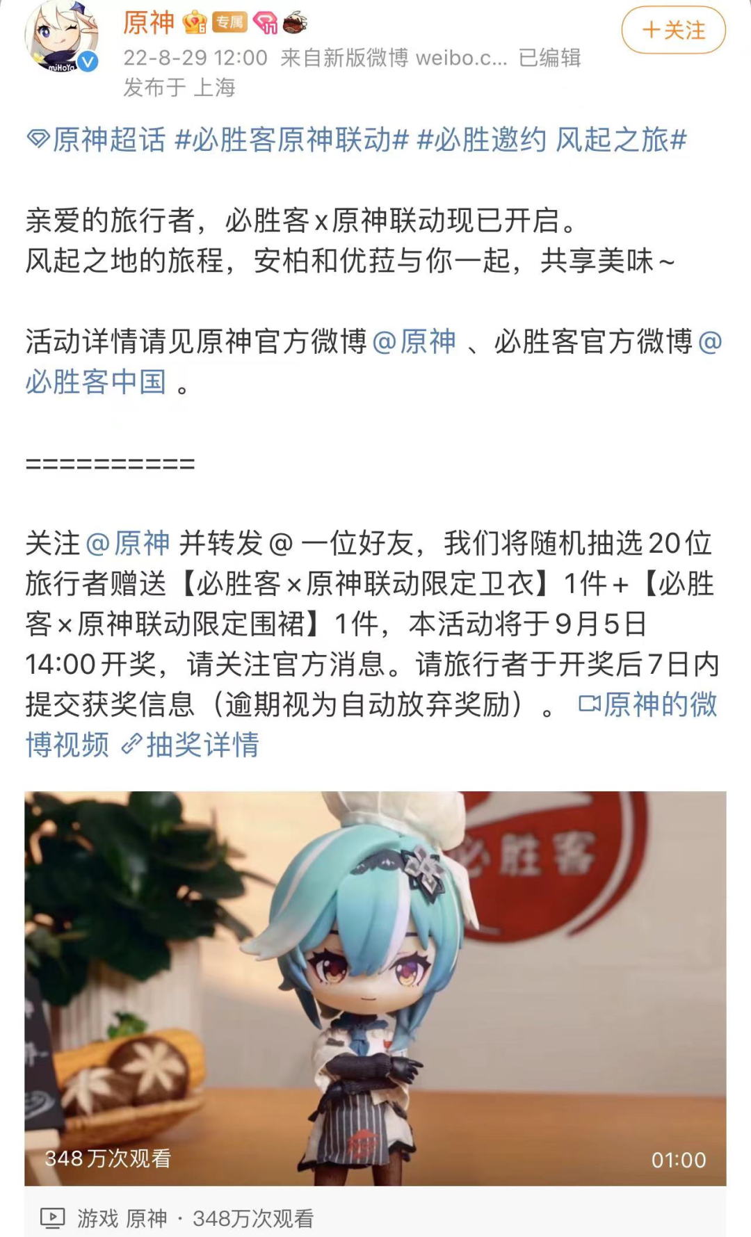 事情起源于8月29日,必胜客和原神进行了官方联动。必胜客为原神推出了专门的主题套餐以及相应活动。同时,玩家在购买套餐后,还有机会抽奖获得游戏中的道具等等。