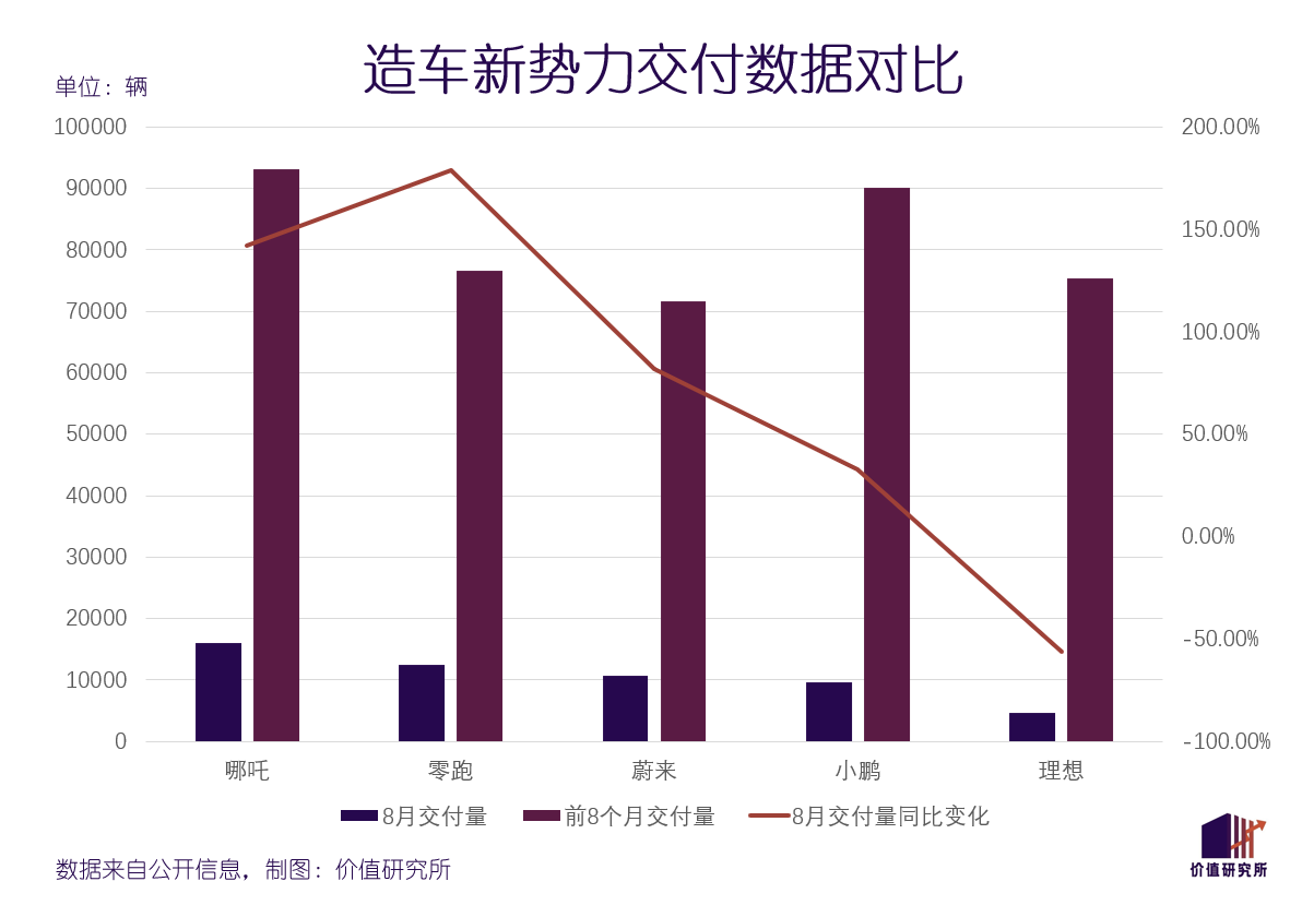 与此同时,还有更多难题等待着它们。公开数据显示,8月造车新势力交付量排行榜中,哪吒、零跑分列前两名,蔚来、小鹏和理想反倒退居二线。尤其是处于产品更迭期的理想,低至4571辆的交付量还不到哪吒的零头,颓势相当明显。