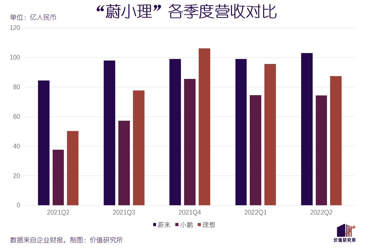 数据显示,蔚来二季度总营收为102.9亿元,同比增长21.8%,理想和小鹏的同期营收则分别为87.33亿元和74.36亿元,同比增速分别为和73.3%和153%。