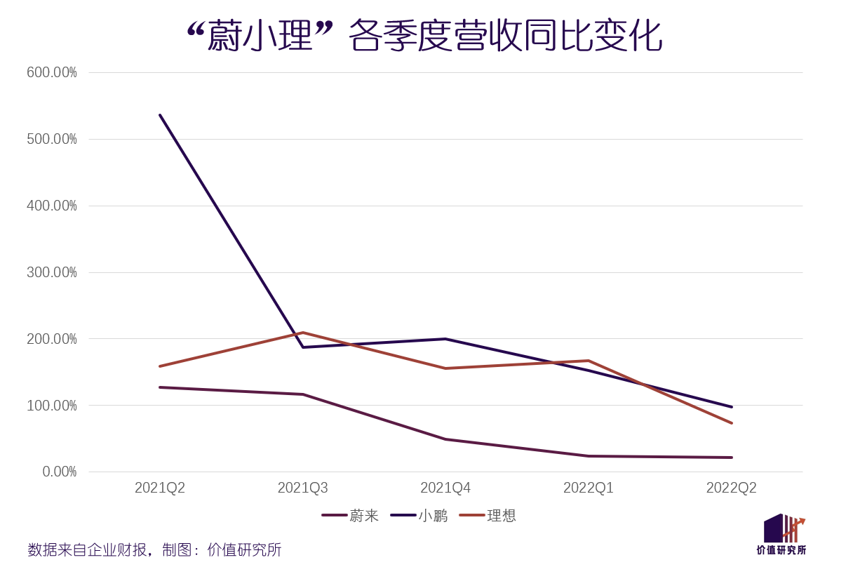 根据财报数据,小鹏营收同比增速在2021年一季度达到616%的巅峰,此后整体走低。今年二季度的同比增速虽然在“蔚小理”横向对比中一马当先,但较去年同期跌去近400个百分点。至于营收规模和增速都夹在中间的理想,本季度营收同比增速自上市后首次跌破三位数,更值得高层引起重视。